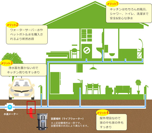 - 浄水箇所:ライブウォーター通過後のすべての蛇口(キッチン・お風呂・シャワー・トイレ 等)