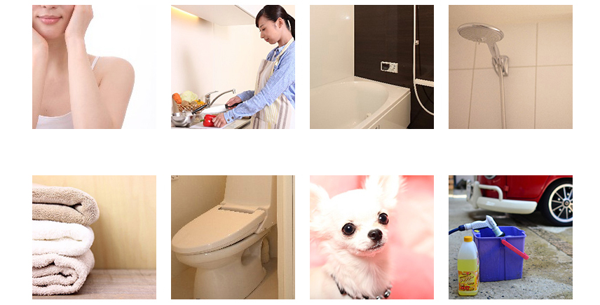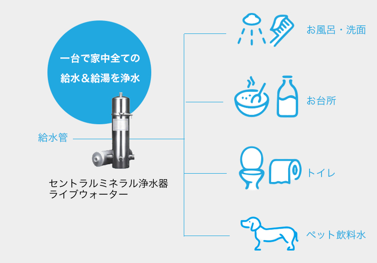 お料理の水・お風呂やシャワー・トイレ・洗顔・洗濯・ペットの水など、暮らしで必要となるすべての水を安全で安心な浄水にします。