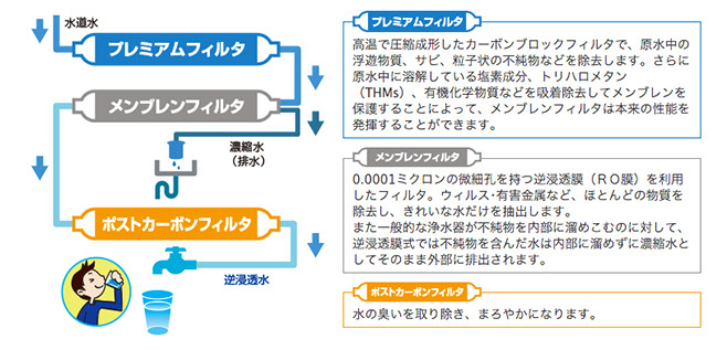 ① 世界最高水準を誇る逆浸透膜技術を採用した浄水器